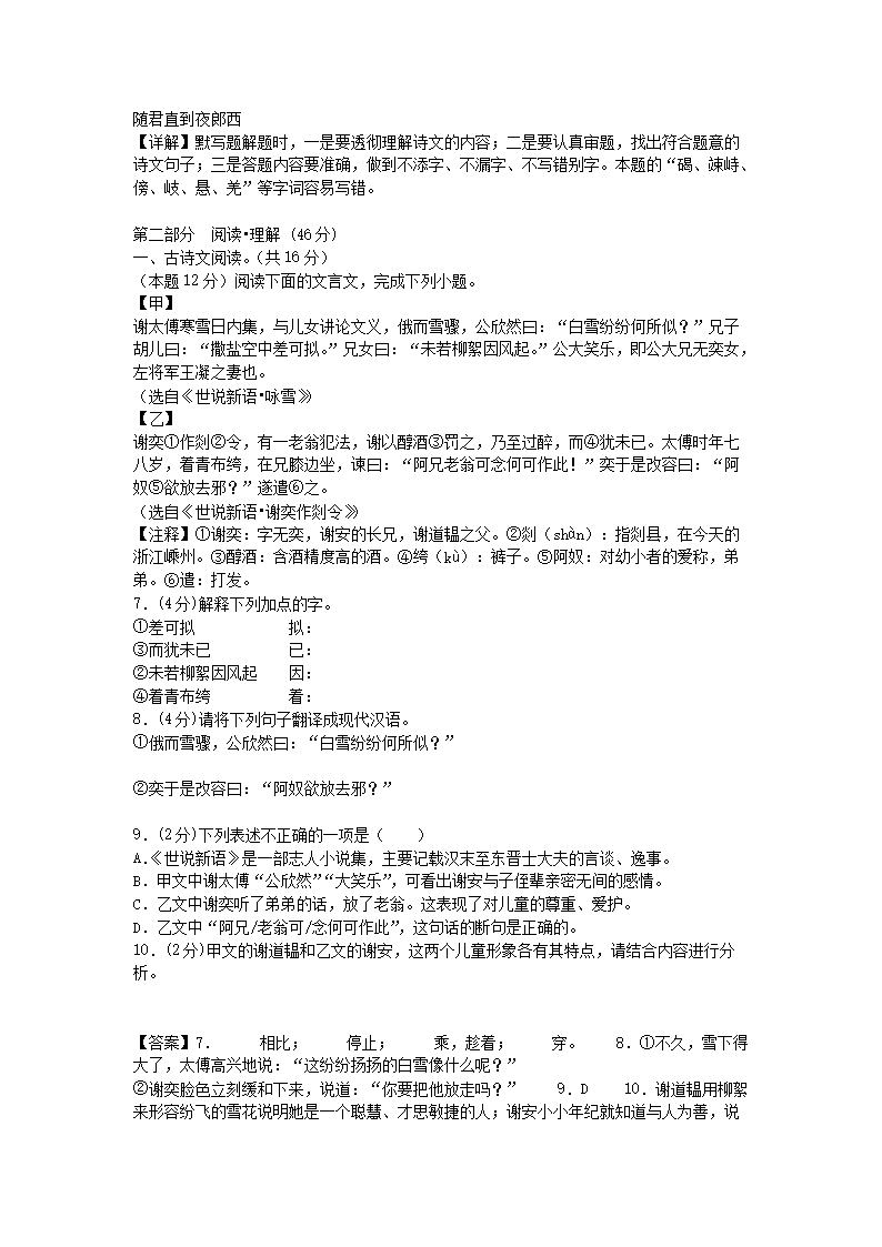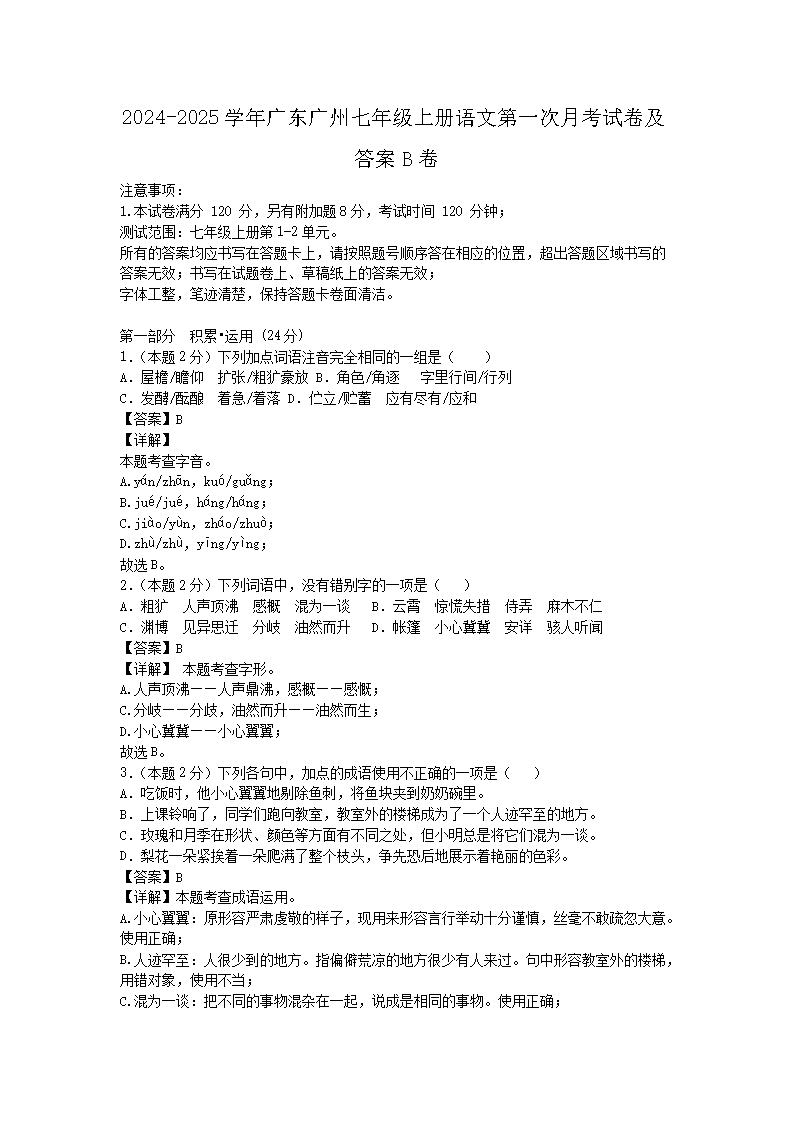 【文檔預(yù)覽】 無憂考網(wǎng)整理發(fā)布2024-2025學(xué)年廣東廣州七年級(jí)上冊(cè)語文第一次月考試卷及答案B卷(Word版),前五頁預(yù)覽如下: