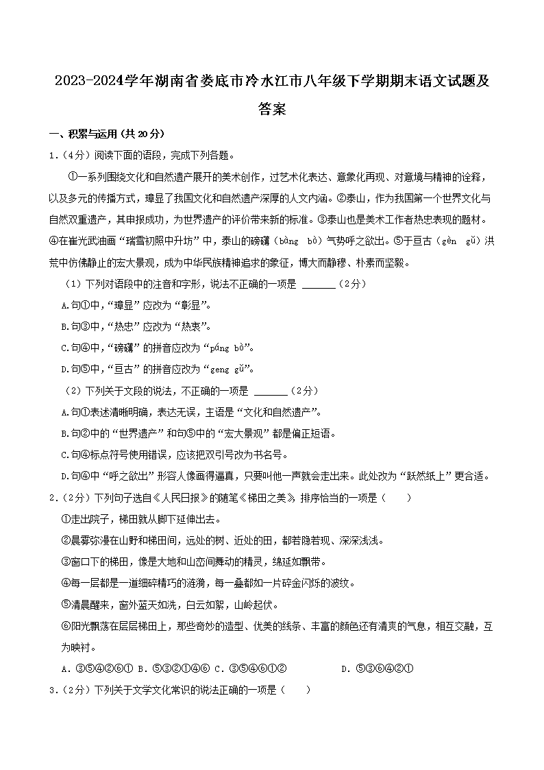 2023-2024學(xué)年湖南省婁底市冷水江市八年級下學(xué)期期末語文試題及答案(Word版)