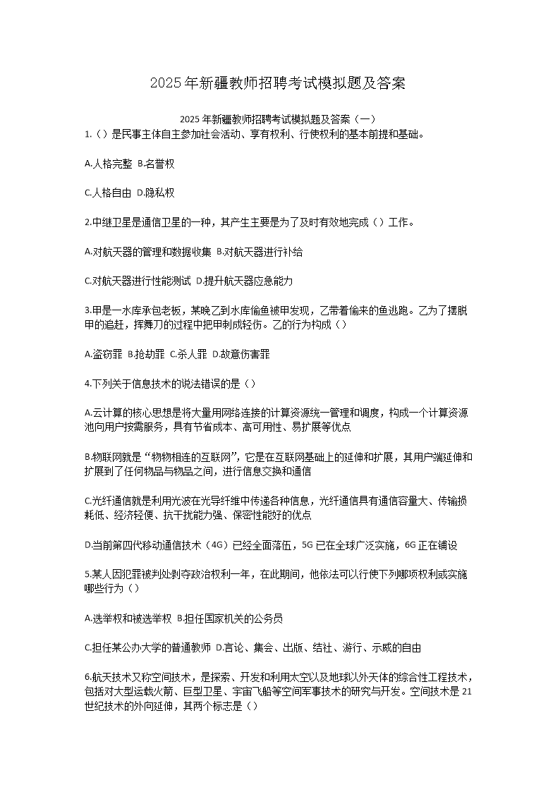 【文檔名稱】 2025年新疆教師招聘考試模擬題及答案(Word版).doc