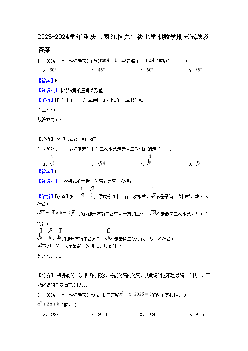 時間:2025-07-08 09:14:00 來源:無憂考網(wǎng) [字體:小 中 大]【文檔名稱】 2023-2024學(xué)年重慶市黔江區(qū)九年級上學(xué)期數(shù)學(xué)期末試題及答案(Word版).doc