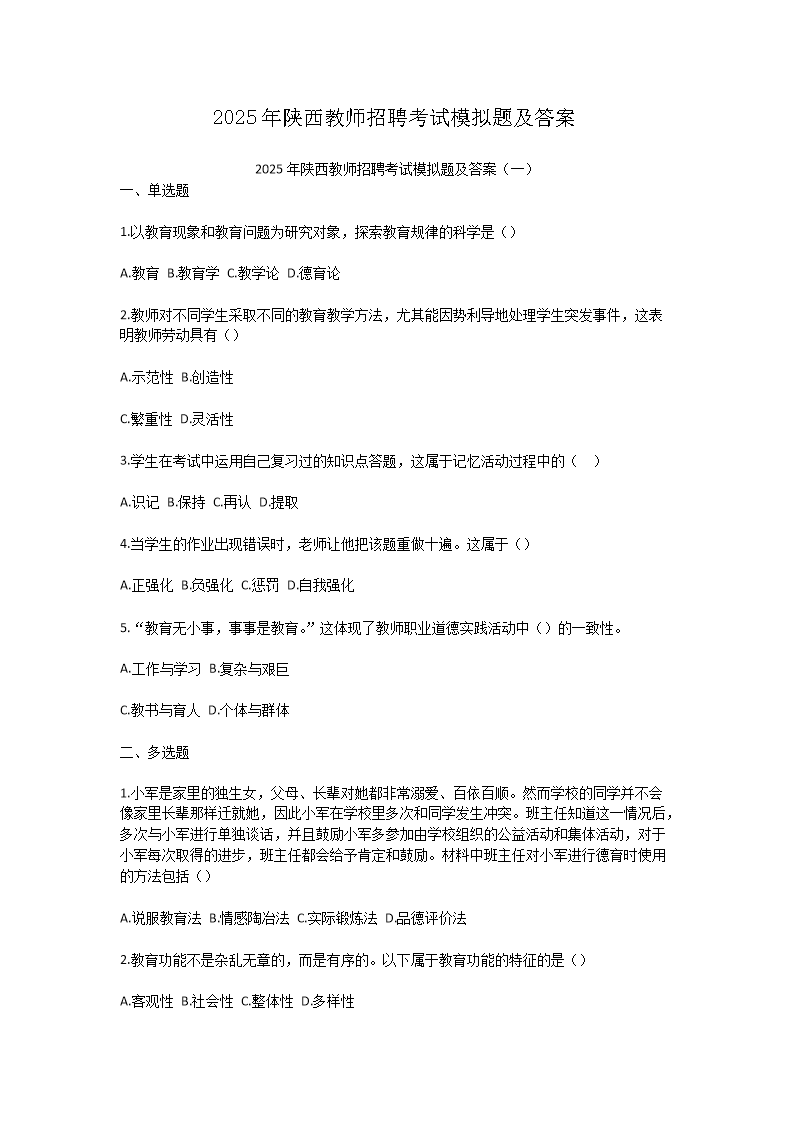 【文檔名稱】 2025年陜西教師招聘考試模擬題及答案(Word版).doc