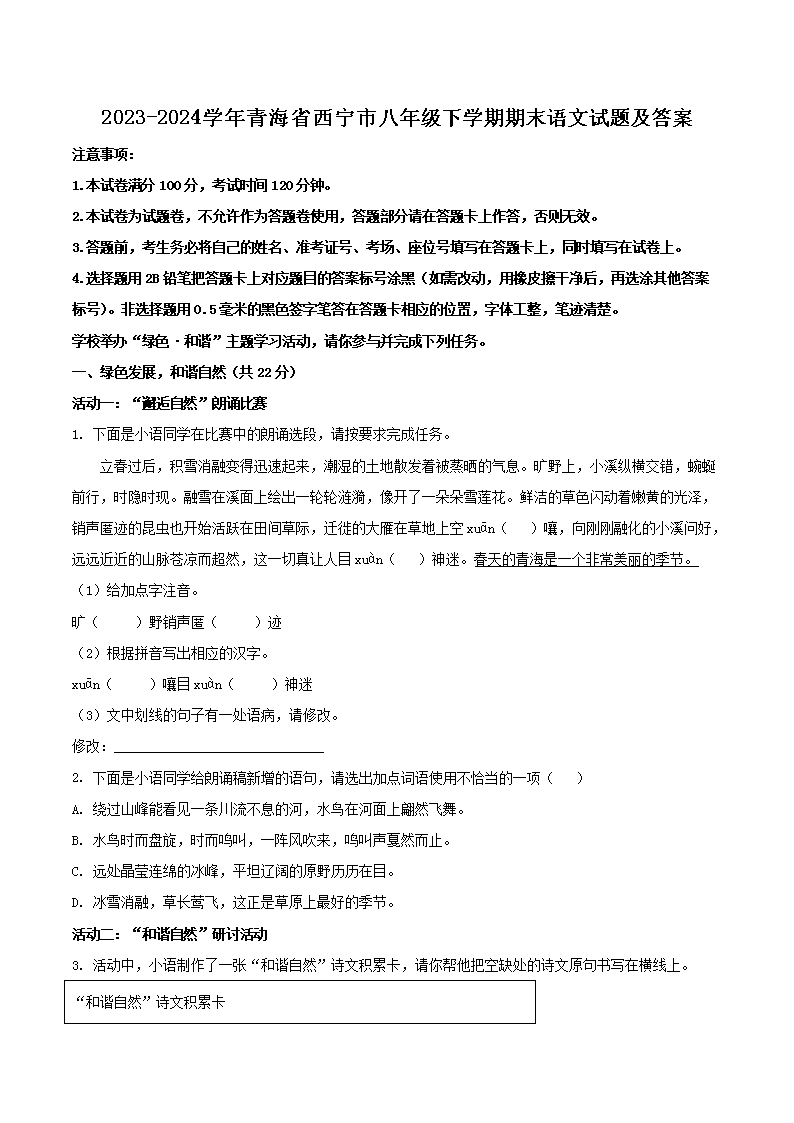 【文檔名稱】 2023-2024學年青海省西寧市八年級下學期期末語文試題及答案(Word版).doc