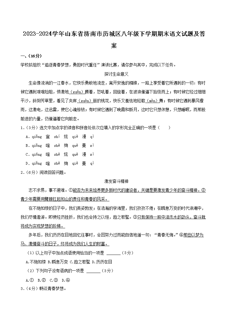 【文檔名稱】 2023-2024學年山東省濟南市歷城區(qū)八年級下學期期末語文試題及答案(Word版).doc