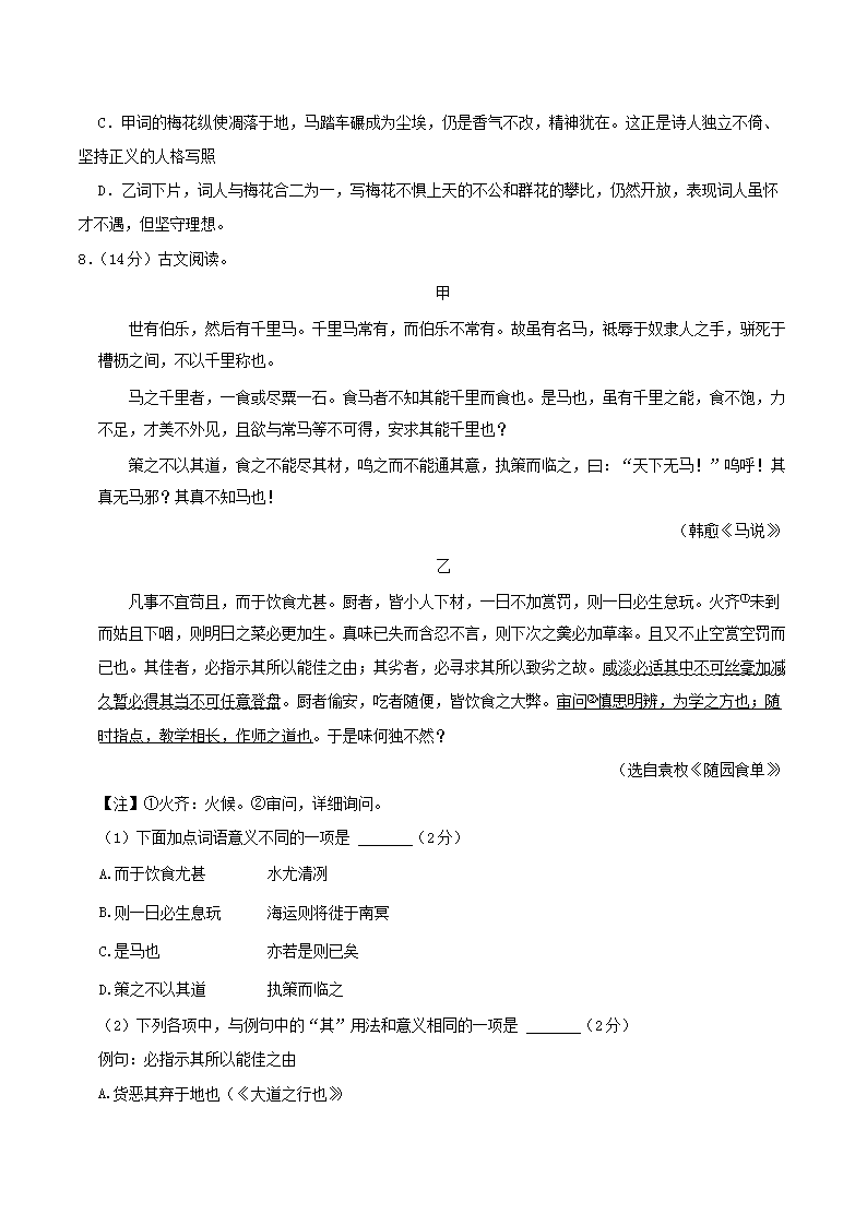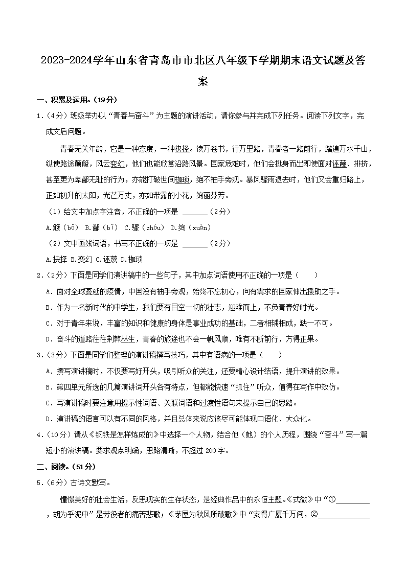 2023-2024學(xué)年山東省青島市市北區(qū)八年級下學(xué)期期末語文試題及答案(Word版)