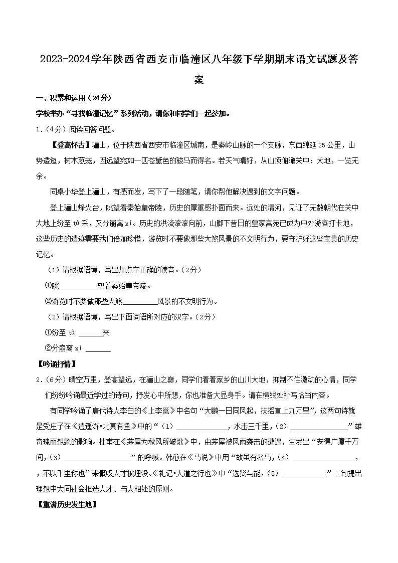 時(shí)間:2025-07-08 17:33:00 來源:無憂考網(wǎng) [字體:小 中 大]【文檔名稱】 2023-2024學(xué)年陜西省西安市臨潼區(qū)八年級(jí)下學(xué)期期末語文試題及答案(Word版).doc
