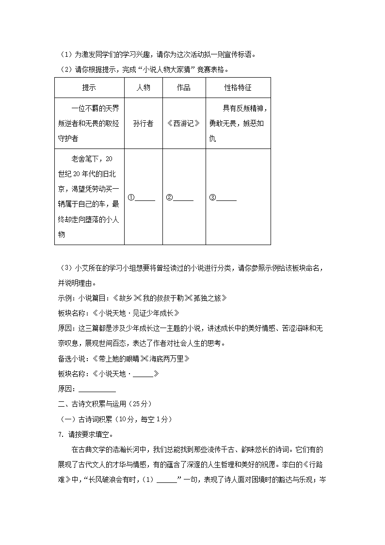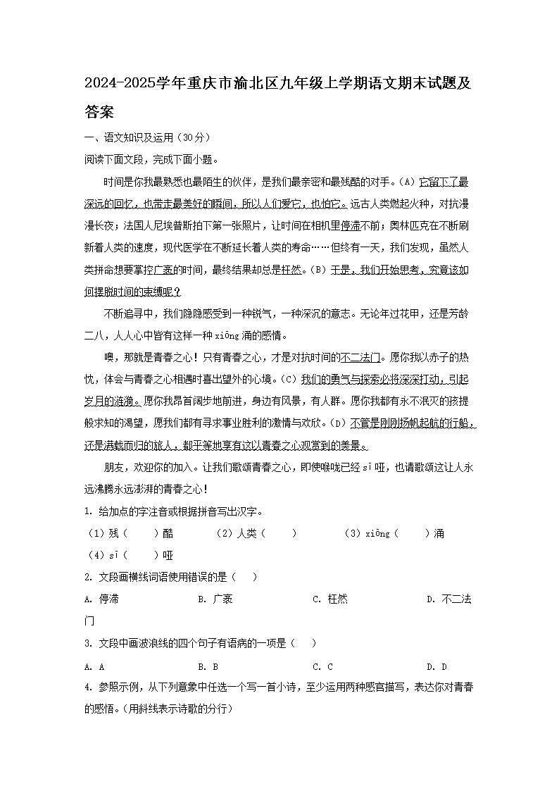 時間:2025-07-10 09:07:00 來源:無憂考網(wǎng) [字體:小 中 大]【文檔名稱】 2024-2025學(xué)年重慶市渝北區(qū)九年級上學(xué)期語文期末試題及答案(Word版).doc