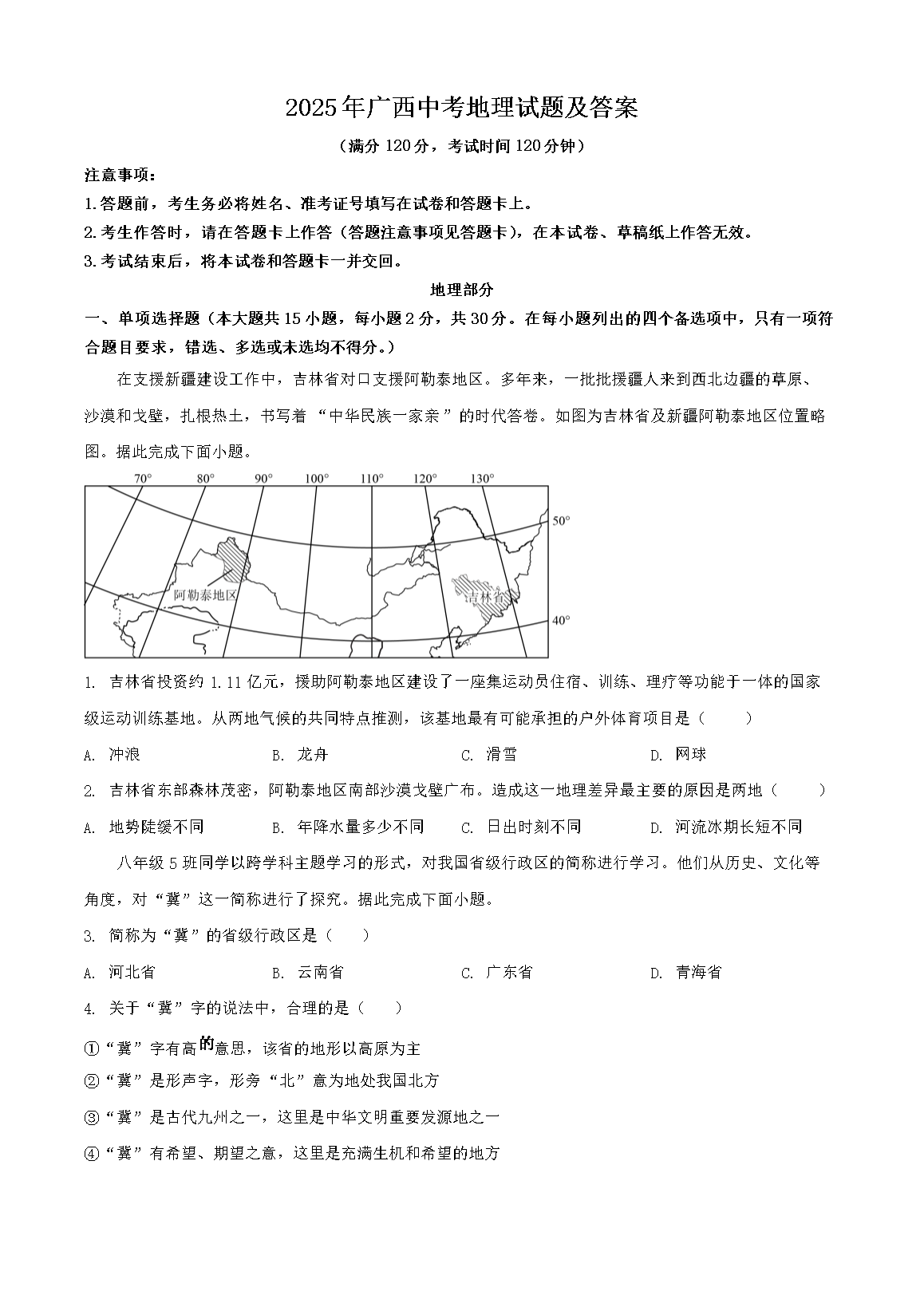 【文檔名稱】 2025年廣西中考地理試題及答案(Word版).doc