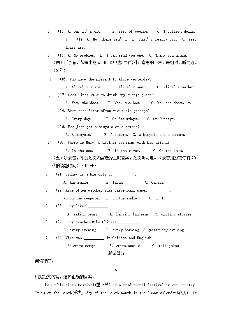 - 2022-2023年山東省菏澤市單縣六年級上冊期末英語試卷及答案(人教PEP版)
