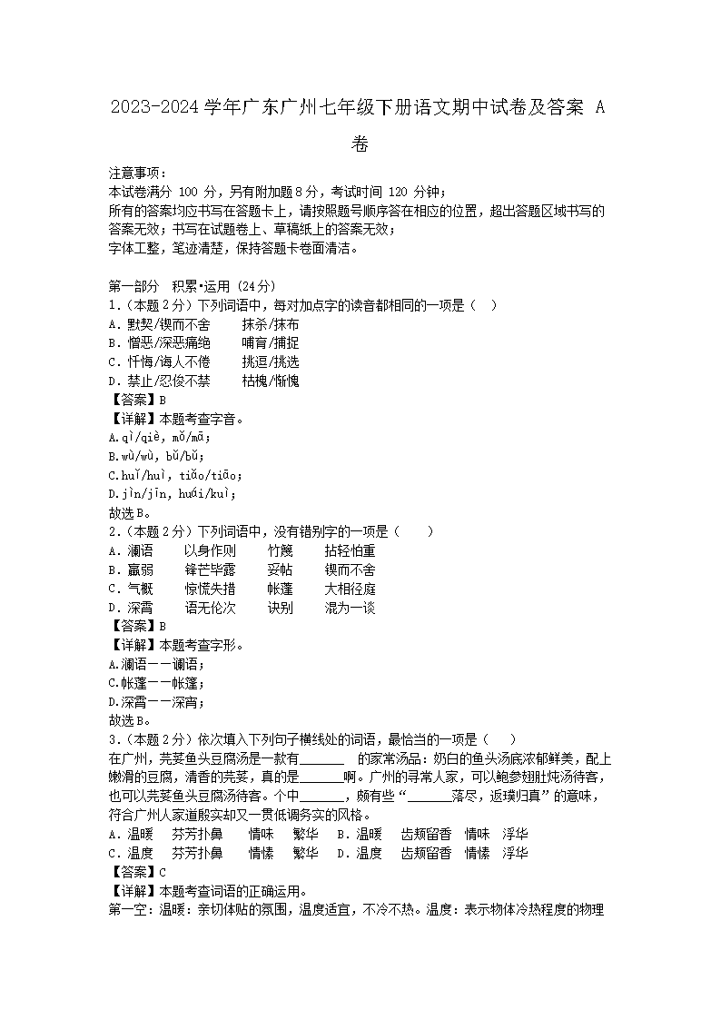 【文檔名稱】 2023-2024學(xué)年廣東廣州七年級下冊語文期中試卷及答案A卷(Word版).doc