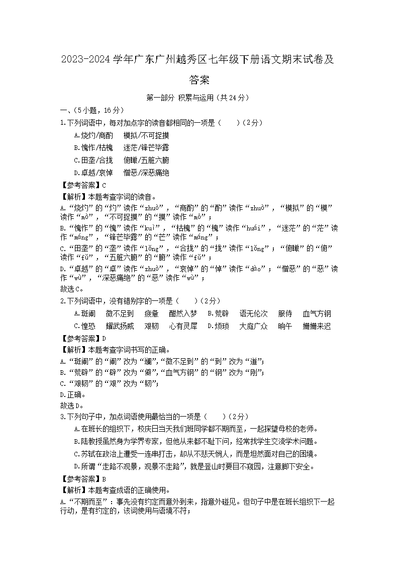 【文檔名稱】 2023-2024學年廣東廣州越秀區(qū)七年級下冊語文期末試卷及答案(Word版).doc