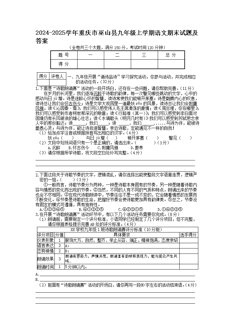 【文檔名稱】 2024-2025學(xué)年重慶市巫山縣九年級上學(xué)期語文期末試題及答案(Word版).doc