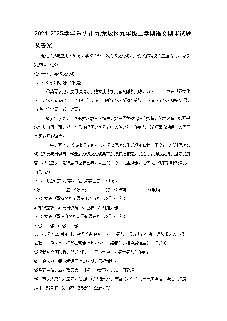 時間:2025-07-15 12:23:00 來源:無憂考網(wǎng) [字體:小 中 大]【文檔名稱】 2024-2025學(xué)年重慶市九龍坡區(qū)九年級上學(xué)期語文期末試題及答案(Word版).doc