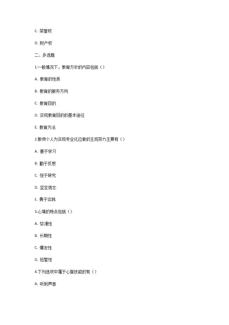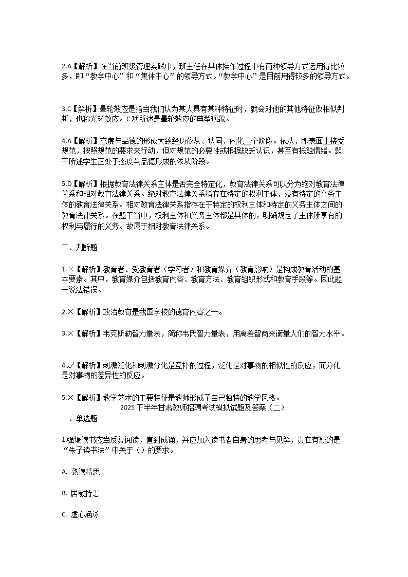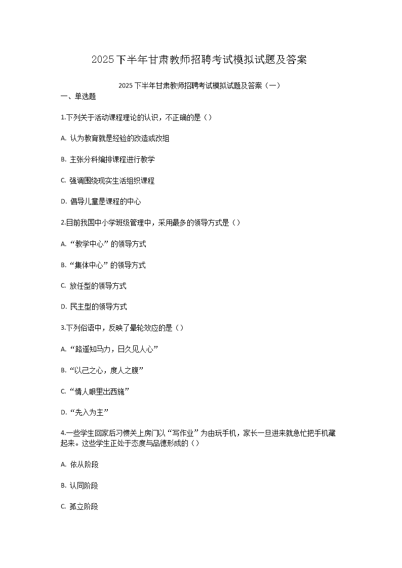 【文檔名稱】 2025下半年甘肅教師招聘考試模擬試題及答案(Word版).doc