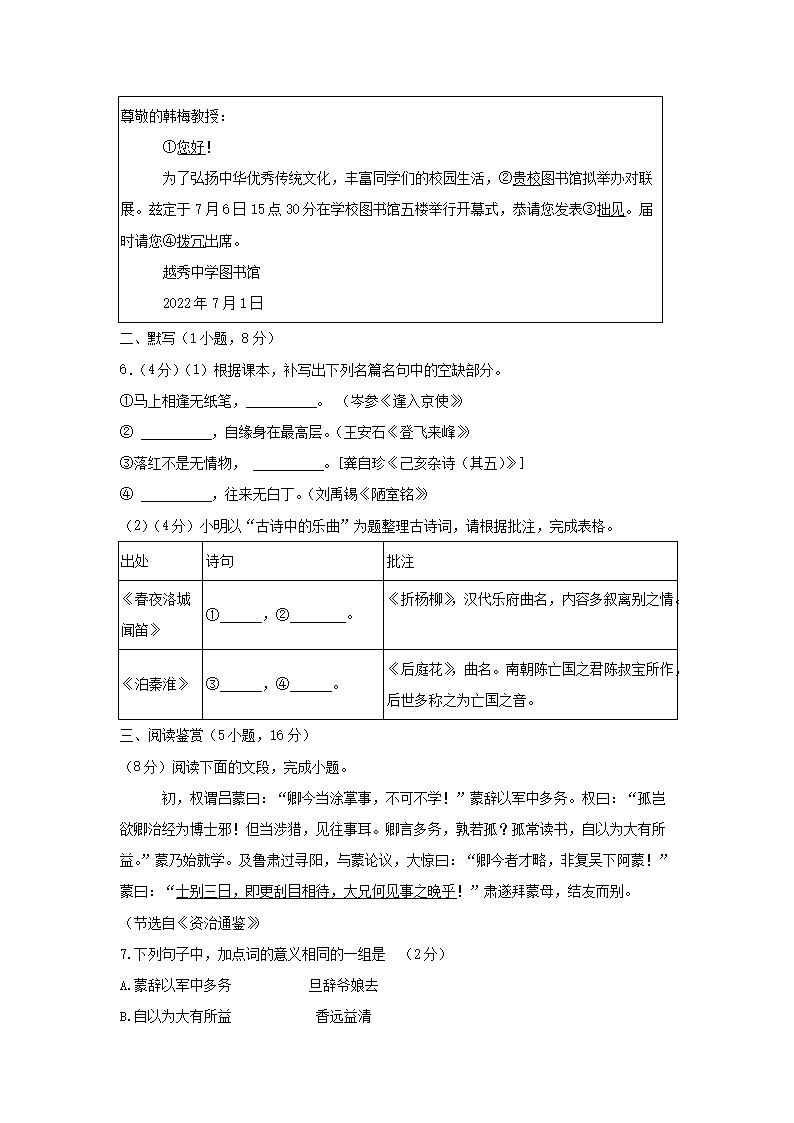 2021-2022學(xué)年廣東廣州越秀區(qū)七年級(jí)下冊(cè)語(yǔ)文期末試卷及答案(Word版)