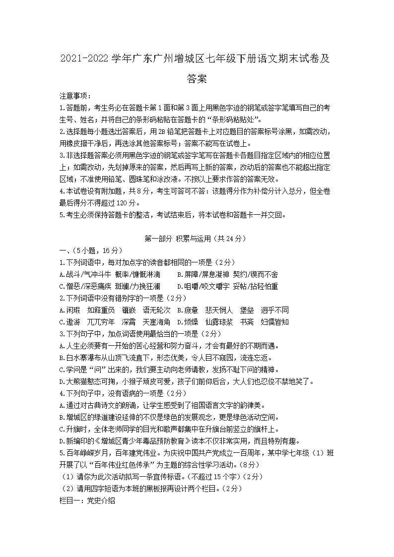 2021-2022學(xué)年廣東廣州增城區(qū)七年級下冊語文期末試卷及答案(Word版)