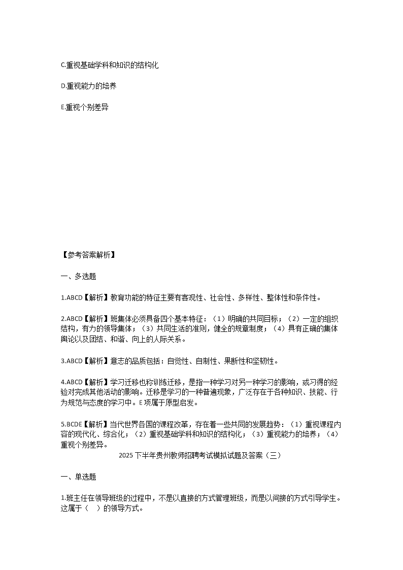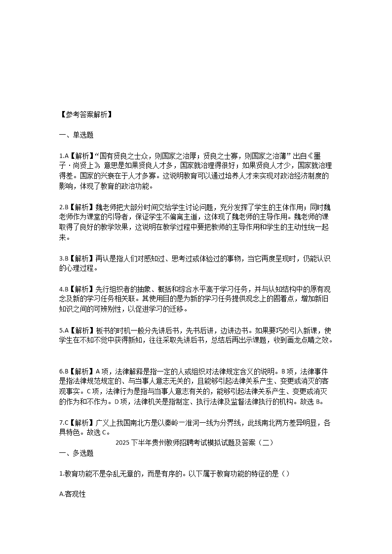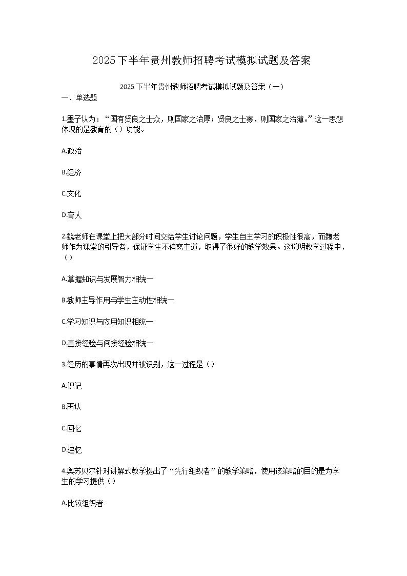 【文檔名稱】 2025下半年貴州教師招聘考試模擬試題及答案(Word版).doc