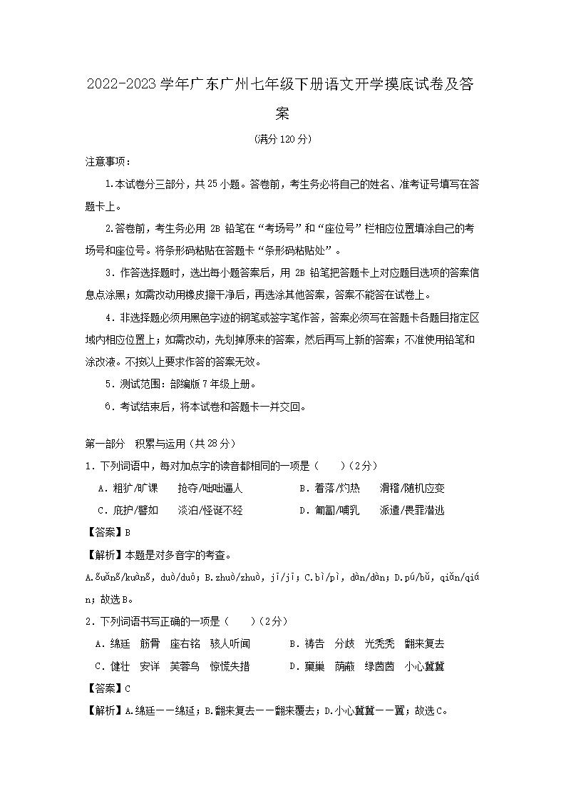 【文檔名稱】 2022-2023學年廣東廣州七年級下冊語文開學摸底試卷及答案(Word版).doc