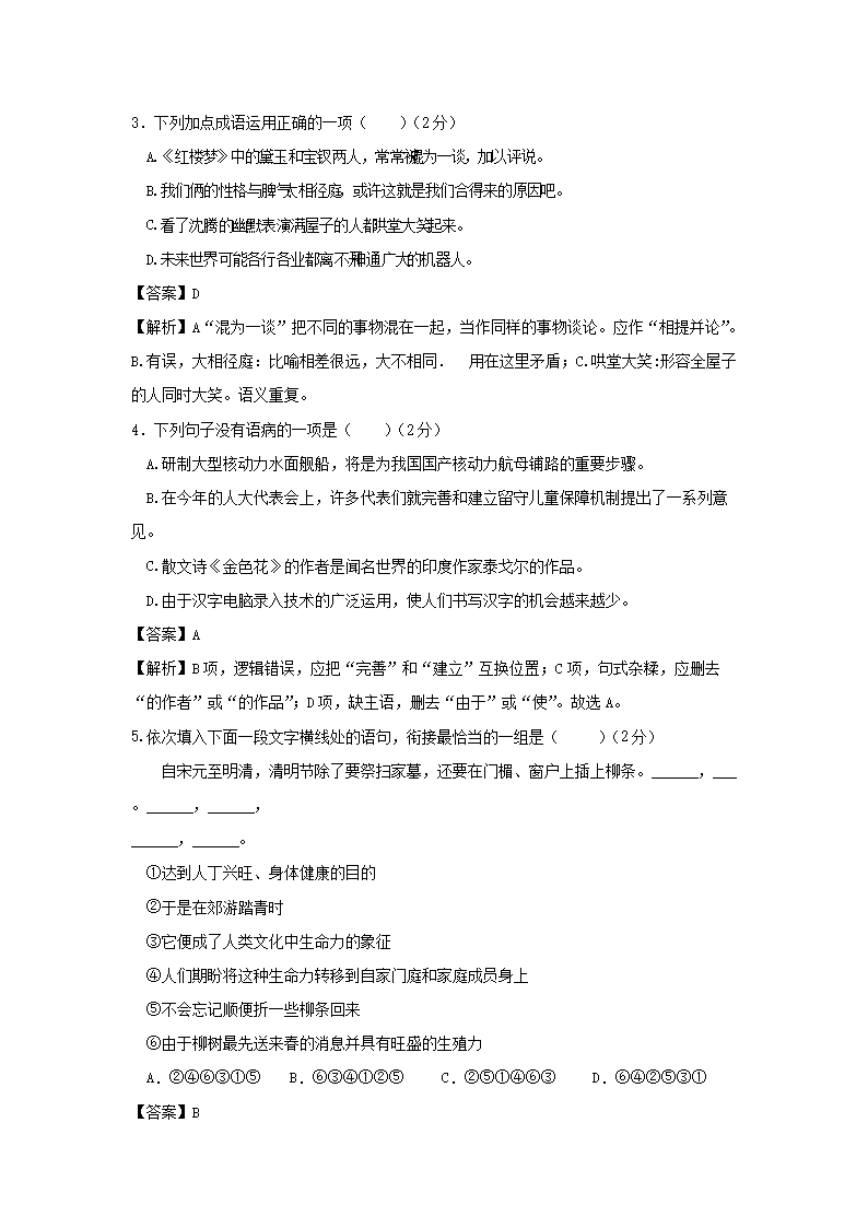 - 2021-2022學年重慶沙坪壩區(qū)七年級下冊語文第一次月考試卷及答案