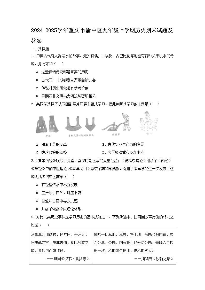 2024-2025學(xué)年重慶市渝中區(qū)九年級上學(xué)期歷史期末試題及答案(Word版)