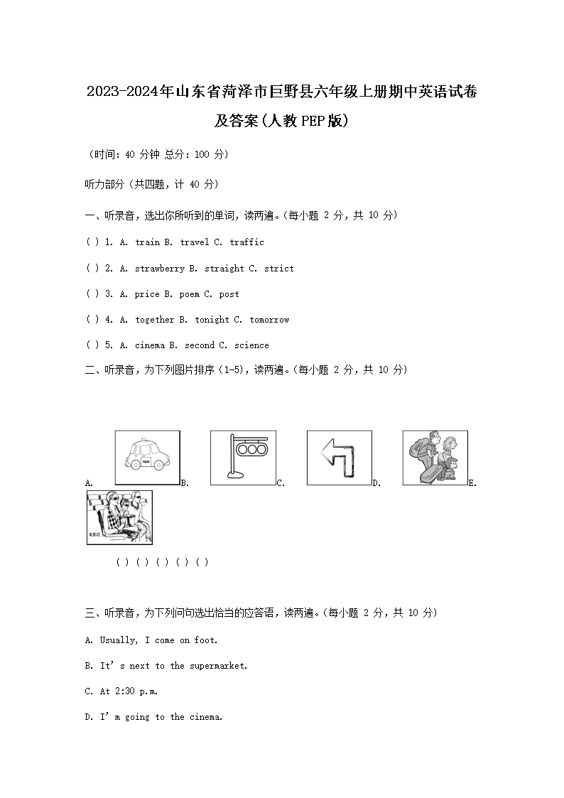 【文檔預(yù)覽】 無(wú)憂考網(wǎng)整理發(fā)布2023-2024年山東省菏澤市巨野縣六年級(jí)上冊(cè)期中英語(yǔ)試卷及答案(人教PEP版)(Word版),前五頁(yè)預(yù)覽如下: