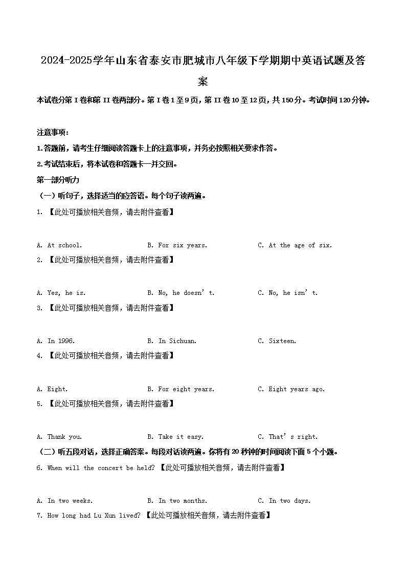 時間:2025-07-17 17:03:00 來源:無憂考網(wǎng) [字體:小 中 大]【文檔名稱】 2024-2025學(xué)年山東省泰安市肥城市八年級下學(xué)期期中英語試題及答案(Word版).doc