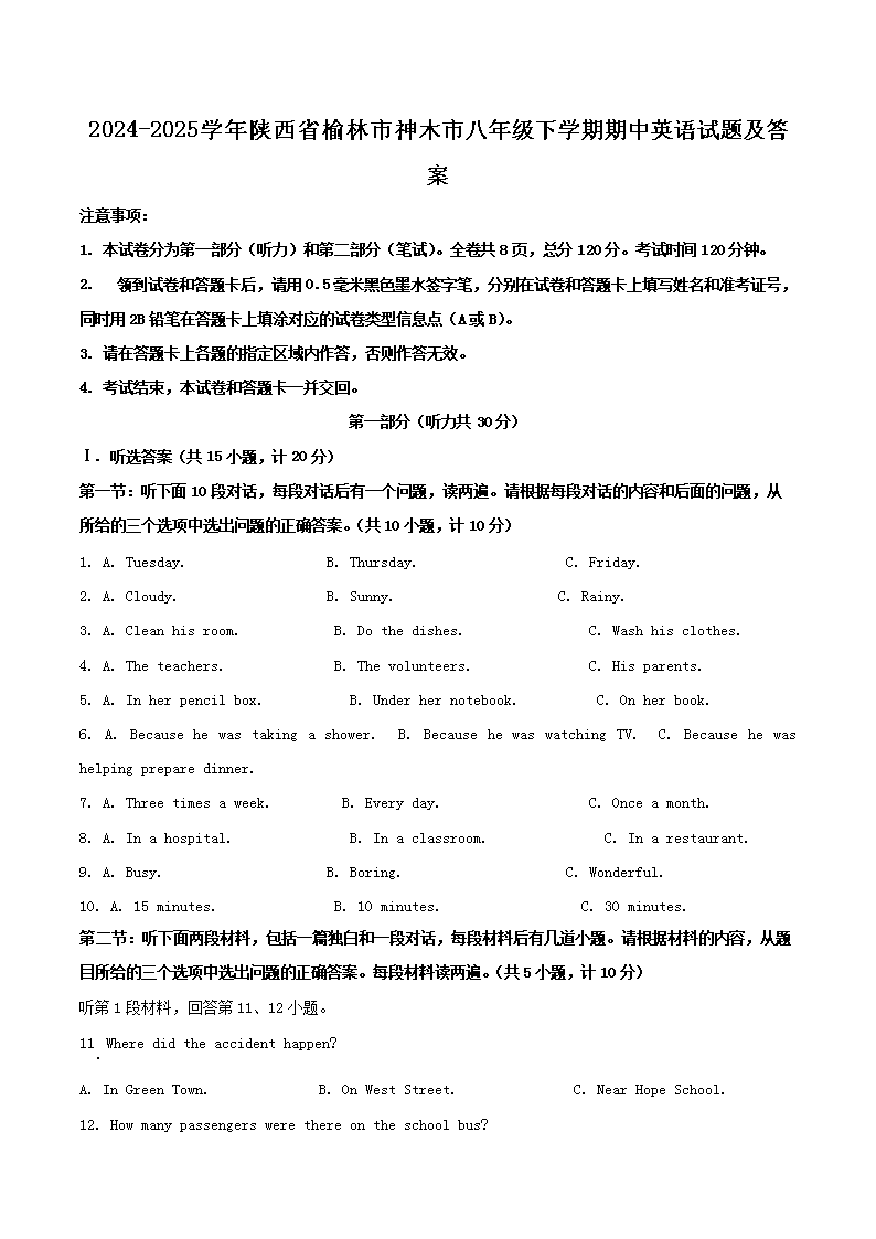 2024-2025學(xué)年陜西省榆林市神木市八年級(jí)下學(xué)期期中英語(yǔ)試題及答案(Word版)