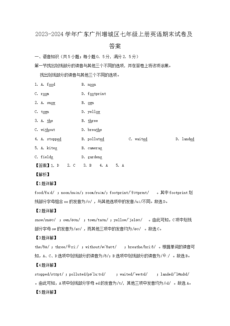 【文檔預(yù)覽】 無憂考網(wǎng)整理發(fā)布2023-2024學(xué)年廣東廣州增城區(qū)七年級上冊英語期末試卷及答案(Word版),前五頁預(yù)覽如下: