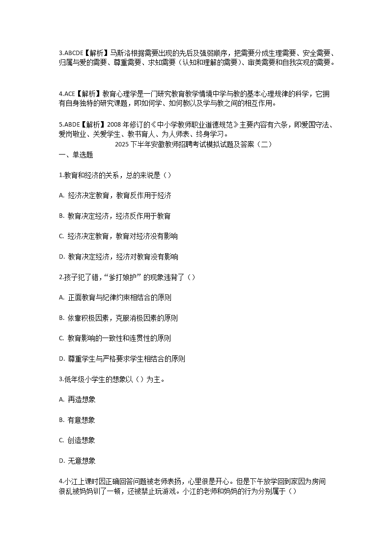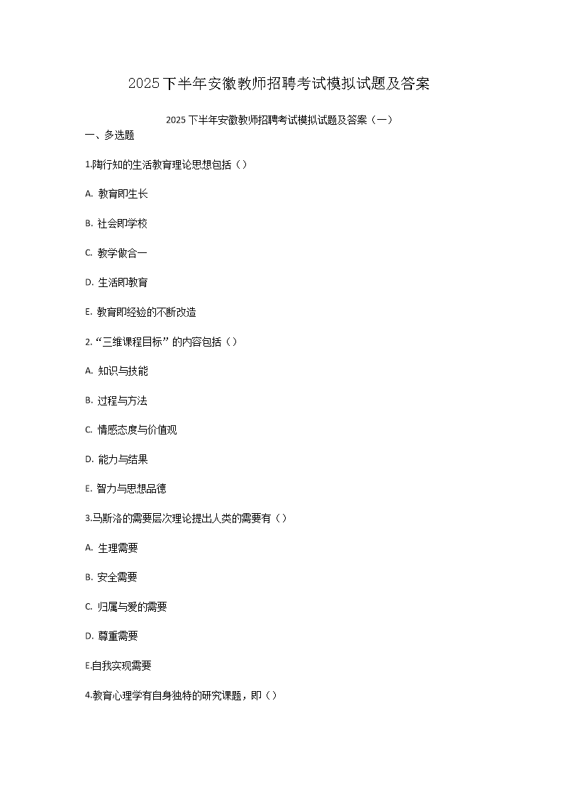 【文檔名稱】 2025下半年安徽教師招聘考試模擬試題及答案(Word版).doc