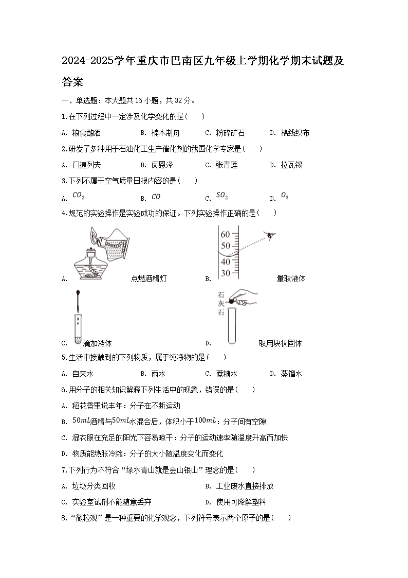 2024-2025學(xué)年重慶市巴南區(qū)九年級(jí)上學(xué)期化學(xué)期末試題及答案(Word版)