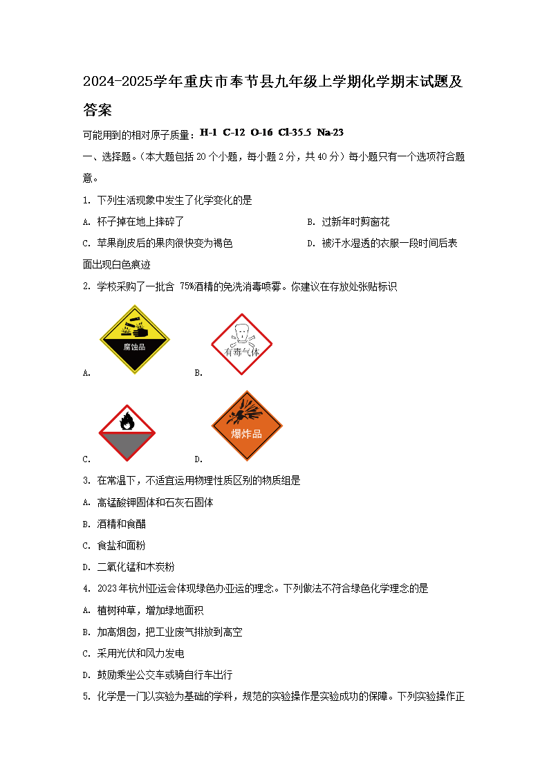 2024-2025學(xué)年重慶市奉節(jié)縣九年級(jí)上學(xué)期化學(xué)期末試題及答案(Word版)