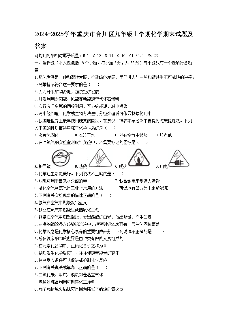 2024-2025學(xué)年重慶市合川區(qū)九年級上學(xué)期化學(xué)期末試題及答案(Word版)