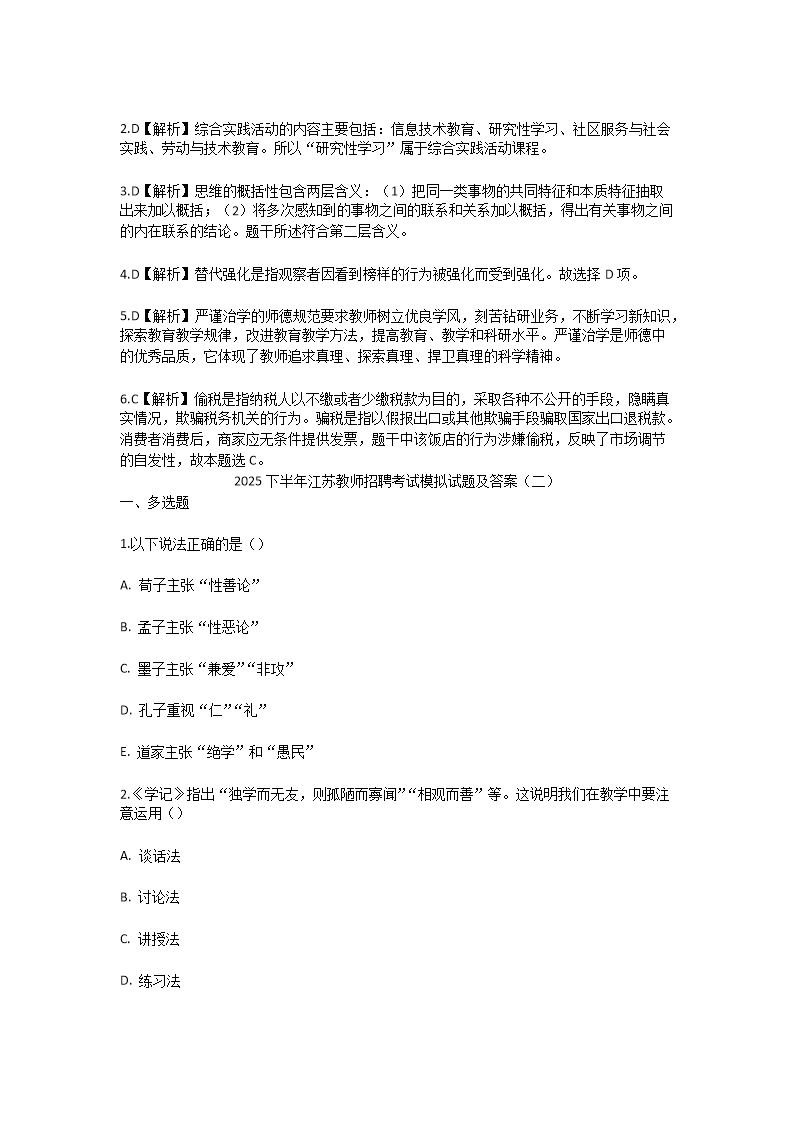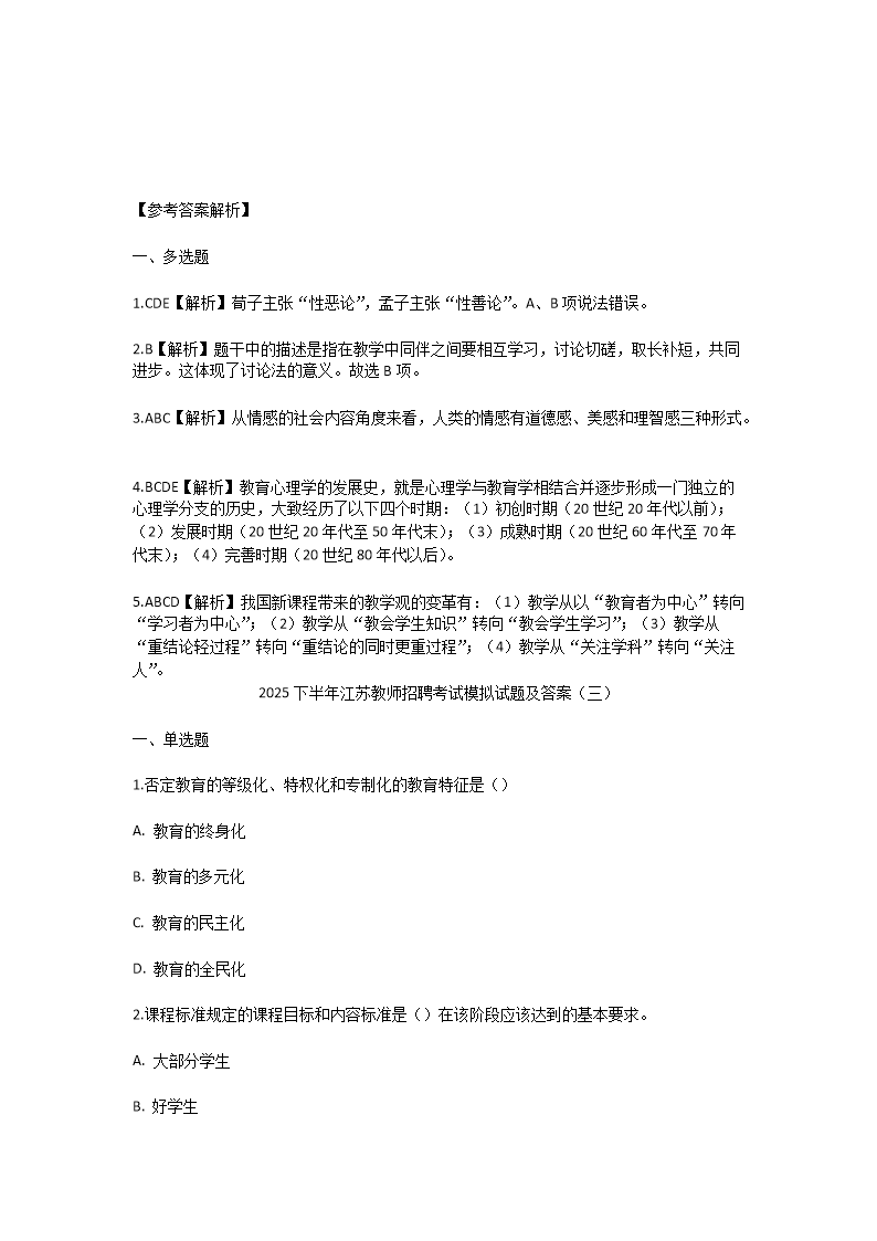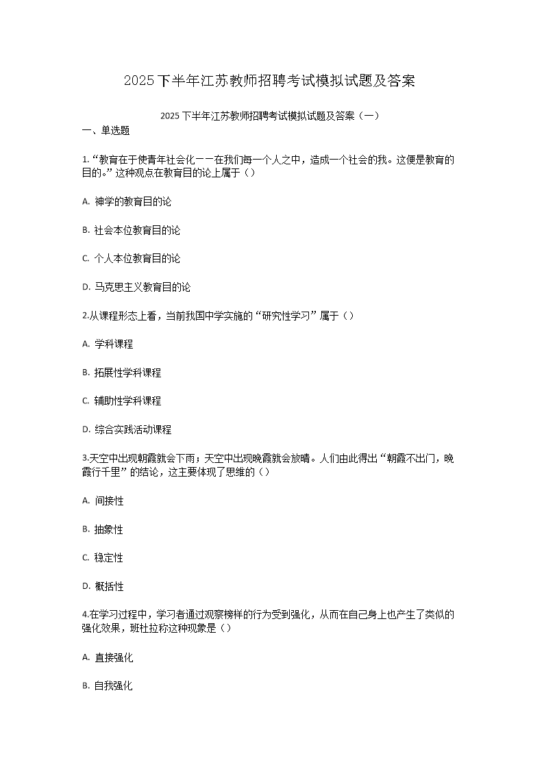 【文檔名稱(chēng)】 2025下半年江蘇教師招聘考試模擬試題及答案(Word版).doc