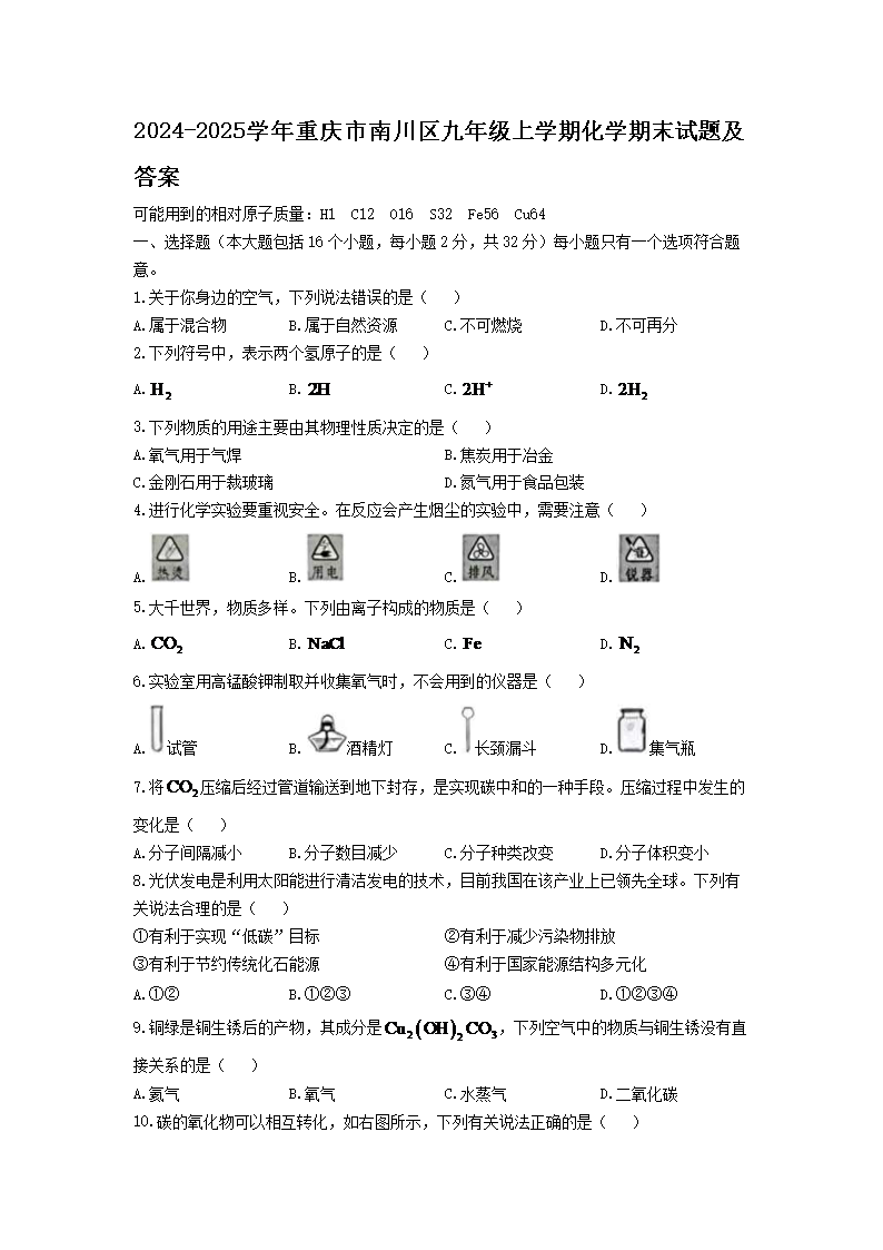 2024-2025學(xué)年重慶市南川區(qū)九年級上學(xué)期化學(xué)期末試題及答案(Word版)