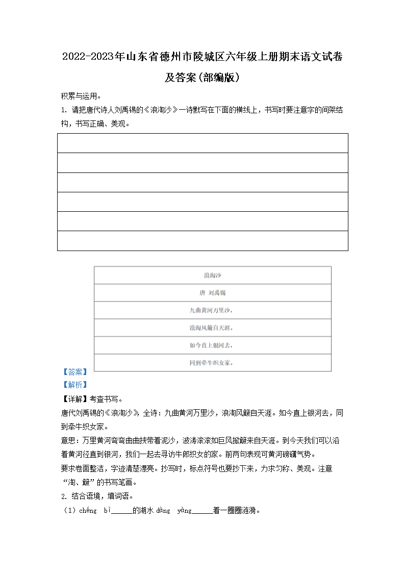 2022-2023年山東省德州市陵城區(qū)六年級(jí)上冊(cè)期末語文試卷及答案(部編版)(Word版)
