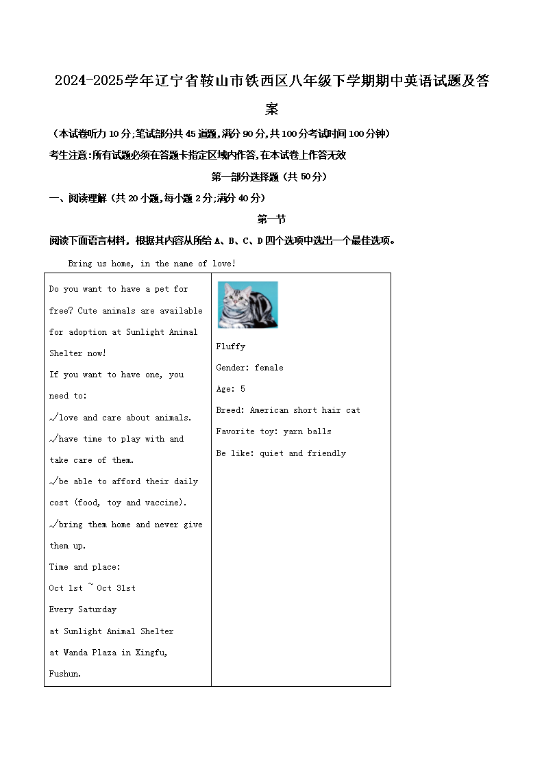 【文檔預(yù)覽】 無(wú)憂考網(wǎng)整理發(fā)布2024-2025學(xué)年遼寧省鞍山市鐵西區(qū)八年級(jí)下學(xué)期期中英語(yǔ)試題及答案(Word版),前五頁(yè)預(yù)覽如下:
