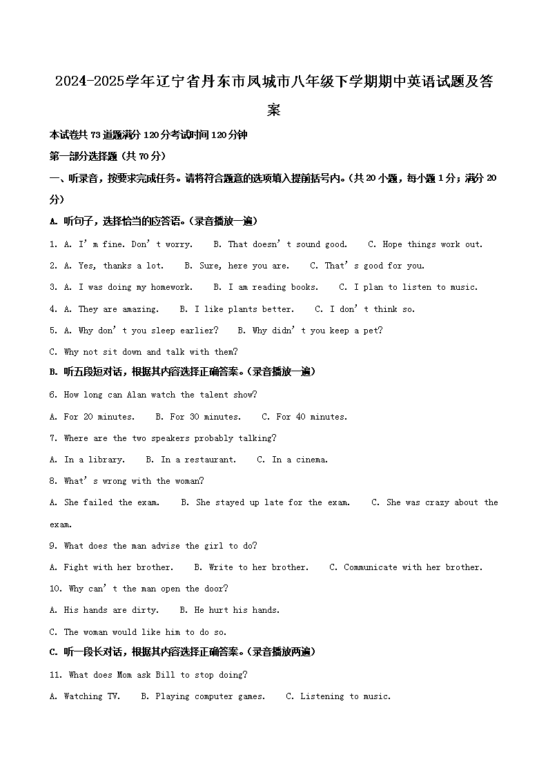 時間:2025-07-23 16:47:00 來源:無憂考網(wǎng) [字體:小 中 大]【文檔名稱】 2024-2025學(xué)年遼寧省丹東市鳳城市八年級下學(xué)期期中英語試題及答案(Word版).doc