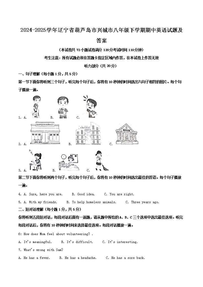 【文檔預(yù)覽】 無憂考網(wǎng)整理發(fā)布2024-2025學(xué)年遼寧省葫蘆島市興城市八年級下學(xué)期期中英語試題及答案(Word版),前五頁預(yù)覽如下: