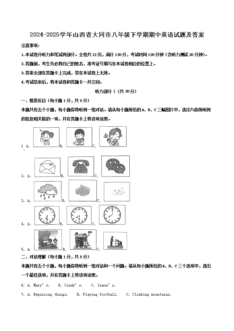 【文檔預(yù)覽】 無憂考網(wǎng)整理發(fā)布2024-2025學年山西省大同市八年級下學期期中英語試題及答案(Word版),前五頁預(yù)覽如下: