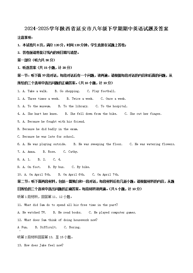 【文檔名稱】 2024-2025學年陜西省延安市八年級下學期期中英語試題及答案(Word版).doc