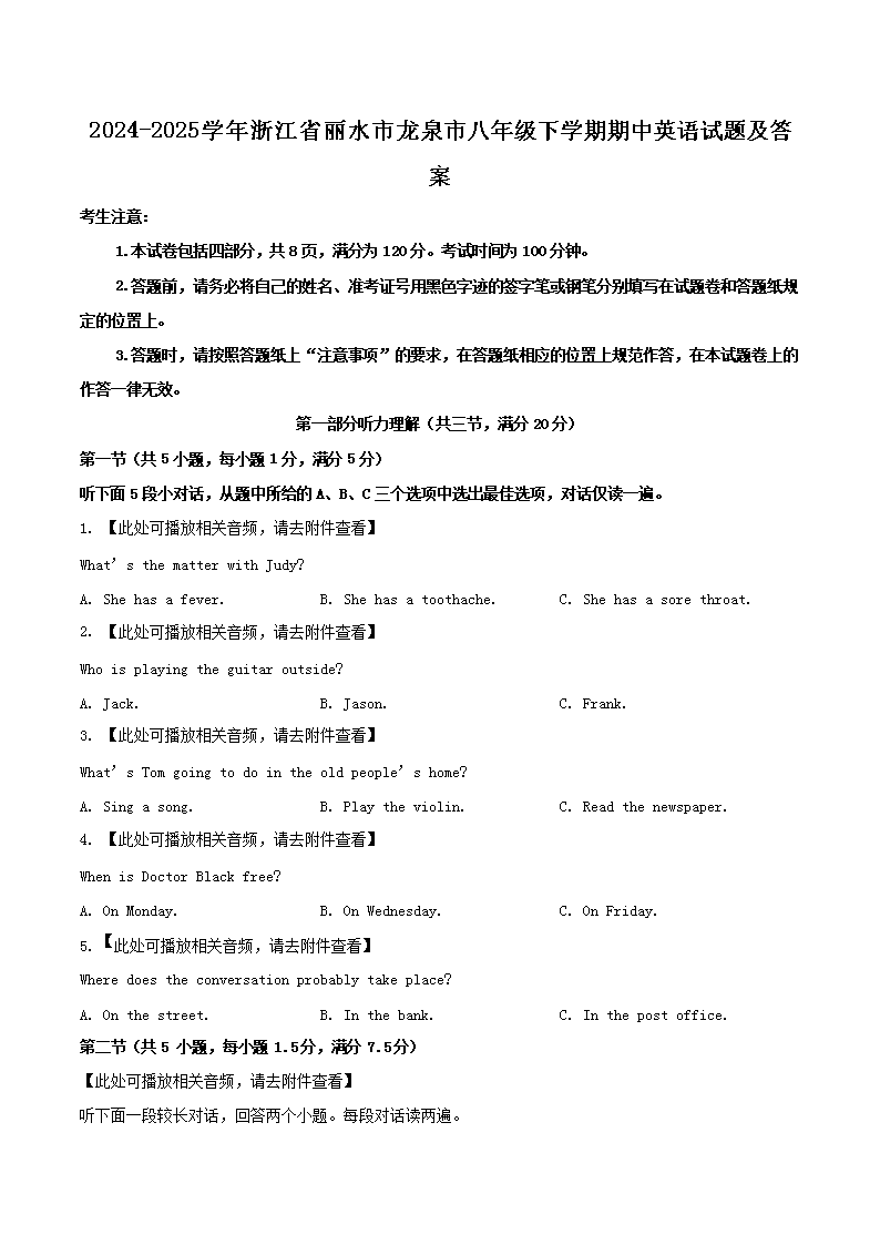 【文檔預覽】 無憂考網(wǎng)整理發(fā)布2024-2025學年浙江省麗水市龍泉市八年級下學期期中英語試題及答案(Word版),前五頁預覽如下: