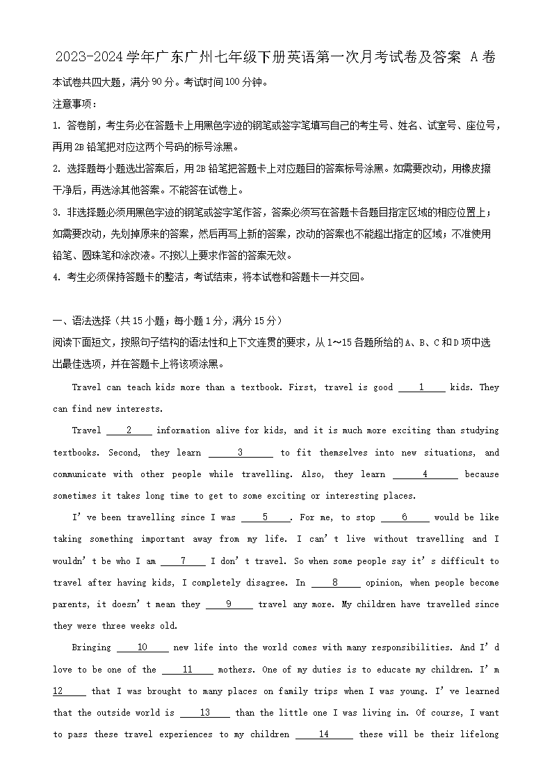 【文檔名稱】 2023-2024學年廣東廣州七年級下冊英語第一次月考試卷及答案A卷(Word版).doc