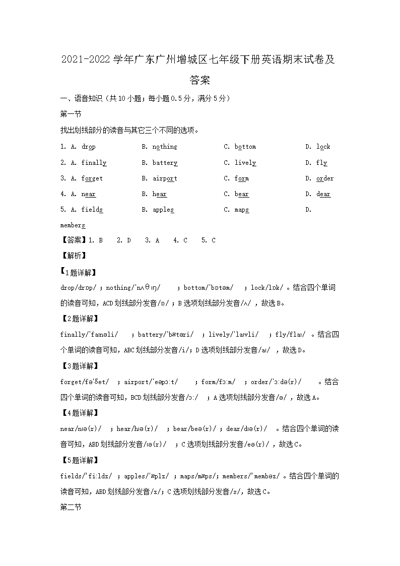 【文檔預覽】 無憂考網整理發(fā)布2021-2022學年廣東廣州增城區(qū)七年級下冊英語期末試卷及答案(Word版),前五頁預覽如下: