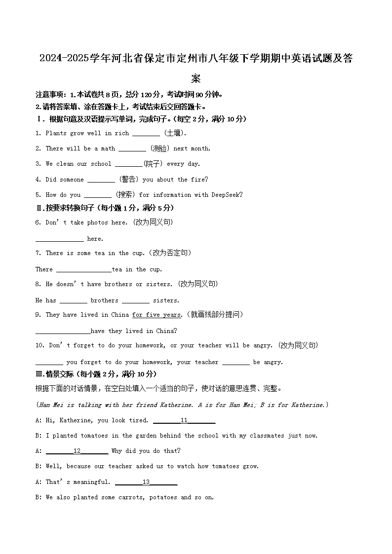 【文檔名稱】 2024-2025學年河北省保定市定州市八年級下學期期中英語試題及答案(Word版).doc