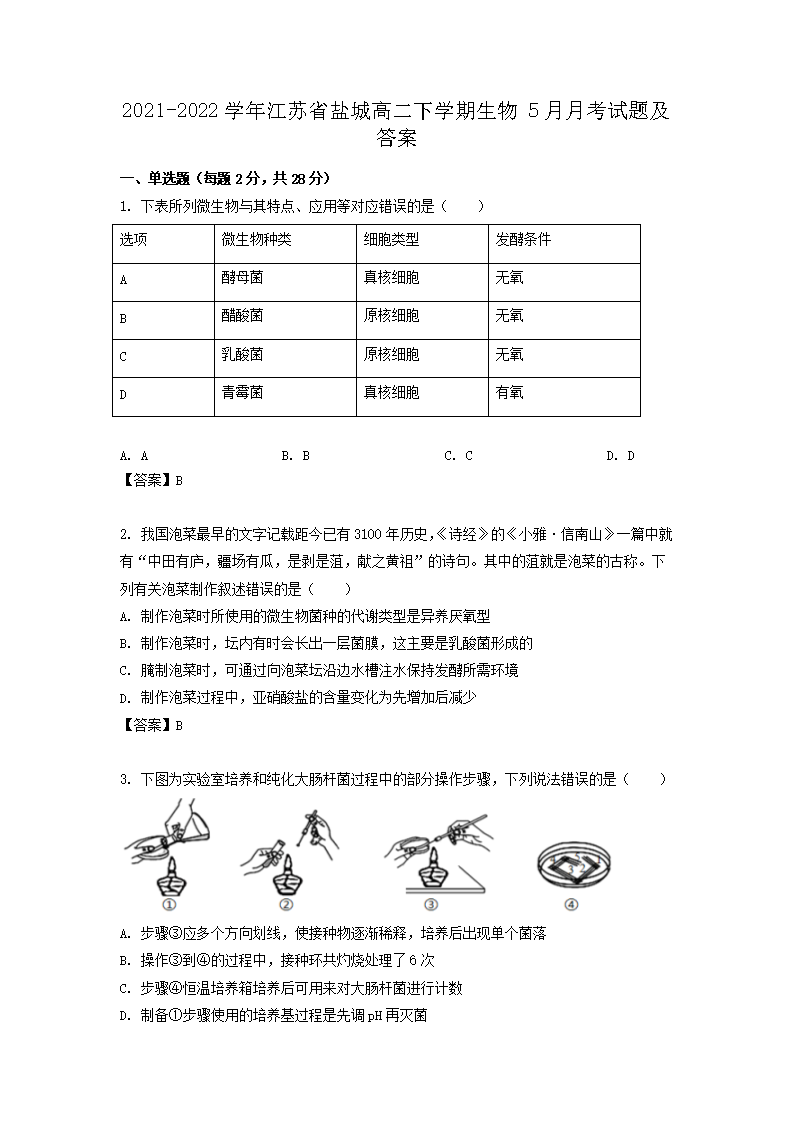 【文檔名稱】 2021-2022學(xué)年江蘇省鹽城高二下學(xué)期生物5月月考試題及答案(Word版).doc