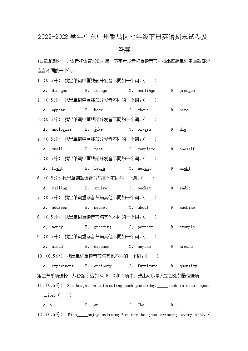 【文檔名稱】 2022-2023學年廣東廣州番禺區(qū)七年級下冊英語期末試卷及答案(Word版).doc