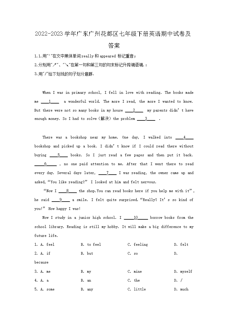【文檔名稱】 2022-2023學(xué)年廣東廣州花都區(qū)七年級下冊英語期中試卷及答案(Word版).doc