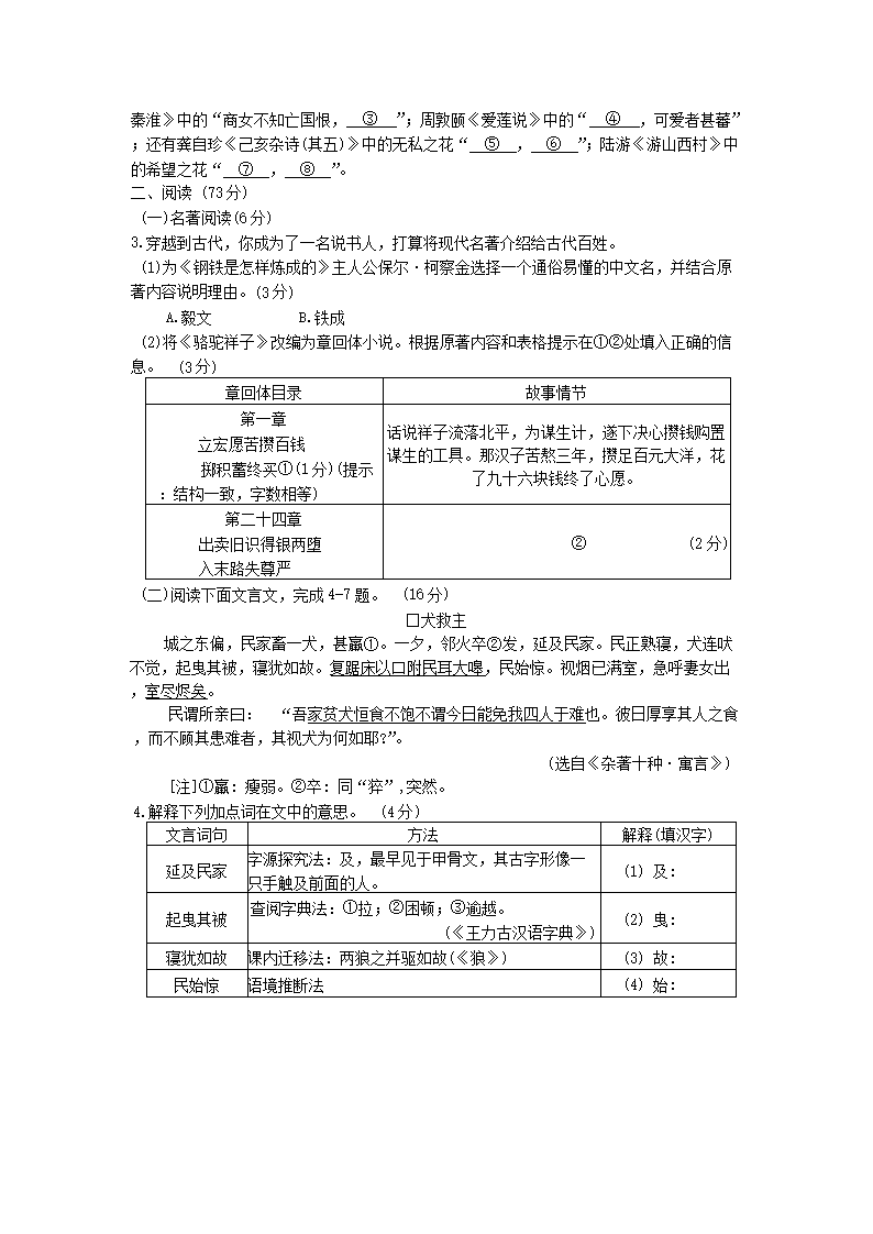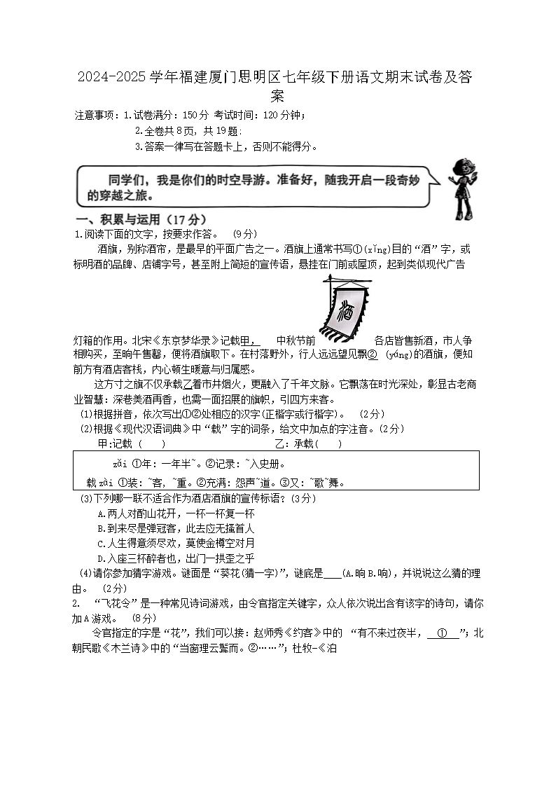 2024-2025學(xué)年福建廈門思明區(qū)七年級(jí)下冊(cè)語(yǔ)文期末試卷及答案(Word版)