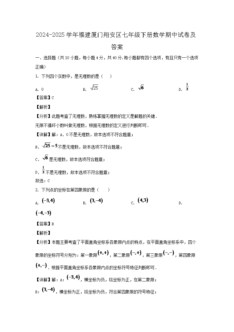 2024-2025學(xué)年福建廈門翔安區(qū)七年級下冊數(shù)學(xué)期中試卷及答案(Word版)