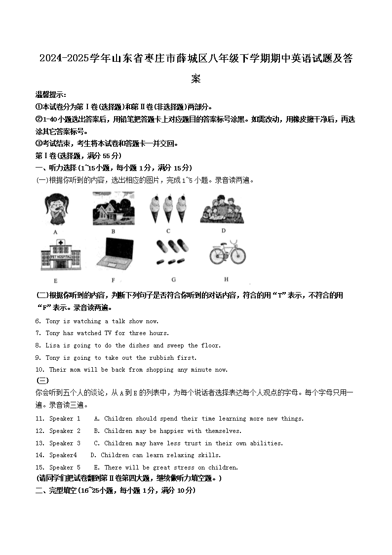 時間:2025-08-01 15:37:00 來源:無憂考網(wǎng) [字體:小 中 大]【文檔名稱】 2024-2025學(xué)年山東省棗莊市薛城區(qū)八年級下學(xué)期期中英語試題及答案(Word版).doc