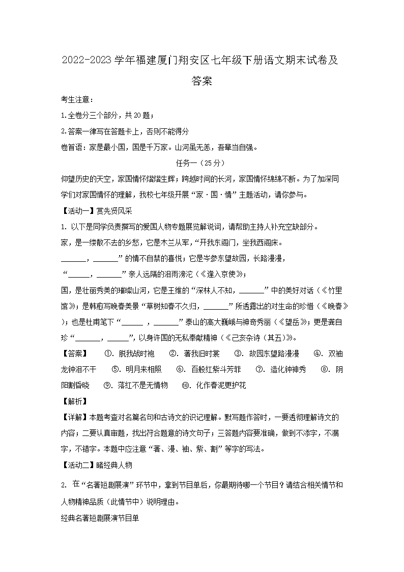 2022-2023學(xué)年福建廈門翔安區(qū)七年級(jí)下冊(cè)語(yǔ)文期末試卷及答案(Word版)